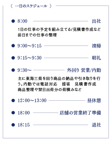 入社して最初は社内業務から。その後先輩社員に同行して徐々に営業を覚えてもらいます。先輩が丁寧に指導しますから安心してご応募ください。