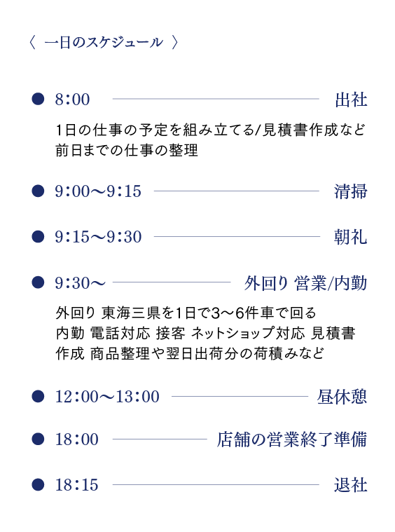 人間的成長をさせてくれる会社です。社長を筆頭にみんなで成長しよう、勉強しようという意識が高いですね。会社のバックアップもあり、私は入社後リフト運転免許、中型免許、運行管理者などの免許を取得。内装関連の資格取得も目指しています。休暇や代休制度なども万全で安心です。