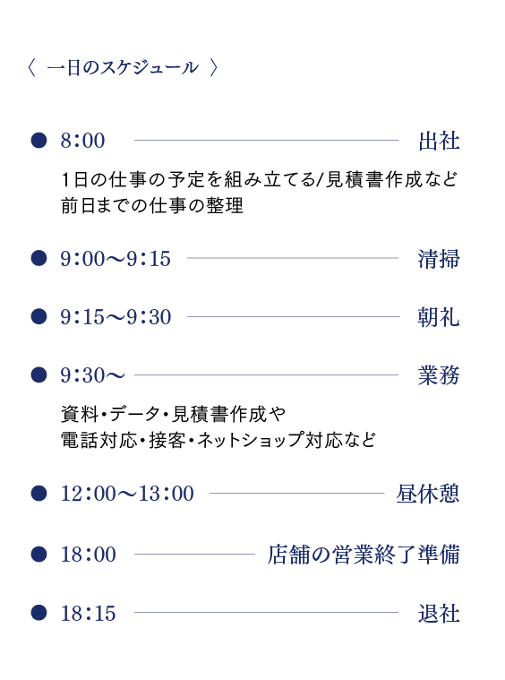 前職はプログラマーで、ウェブ担当者として中途入社しました。PC作業だけでなく、接客など幅広く仕事ができることに魅力を感じました。